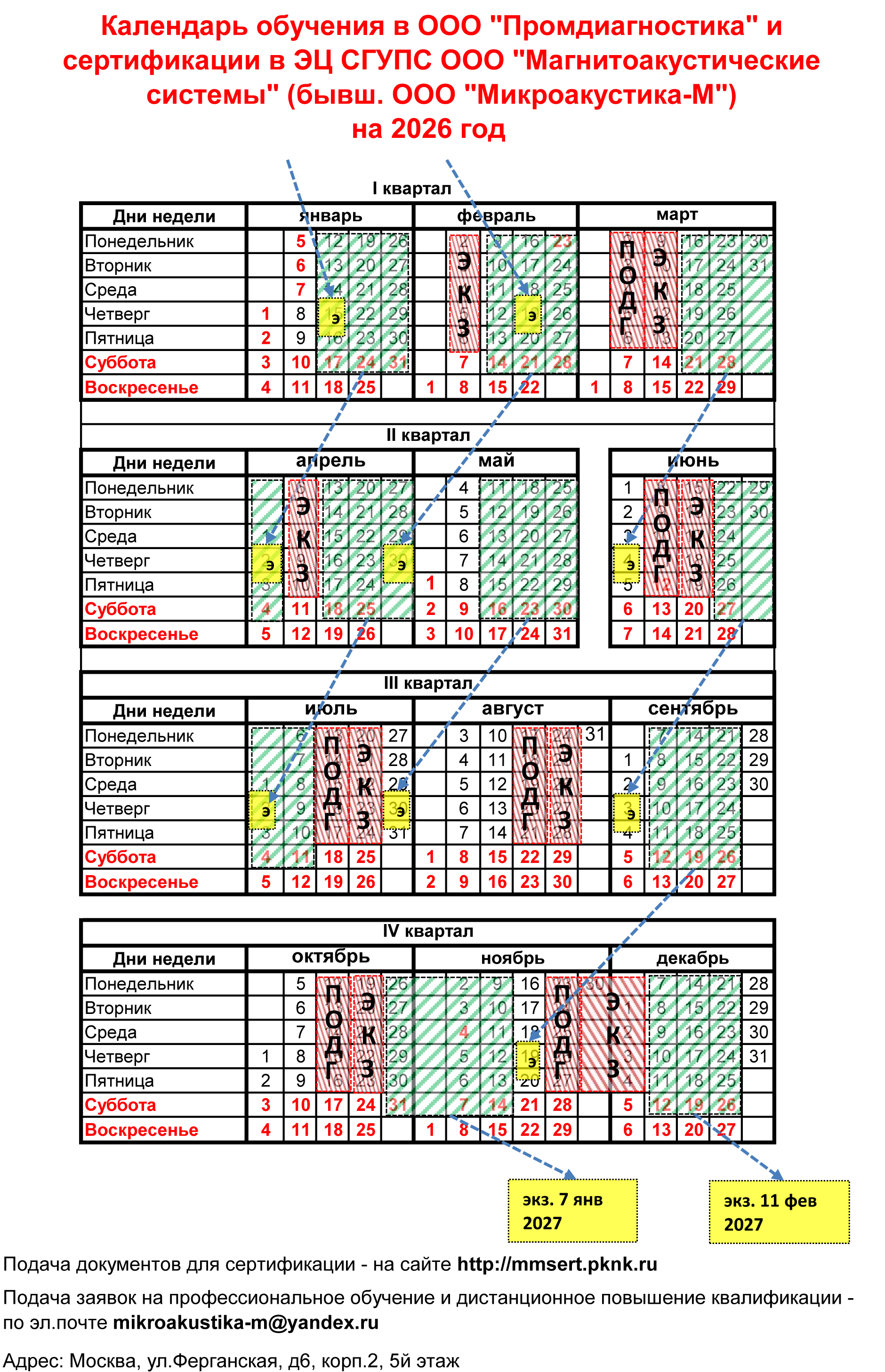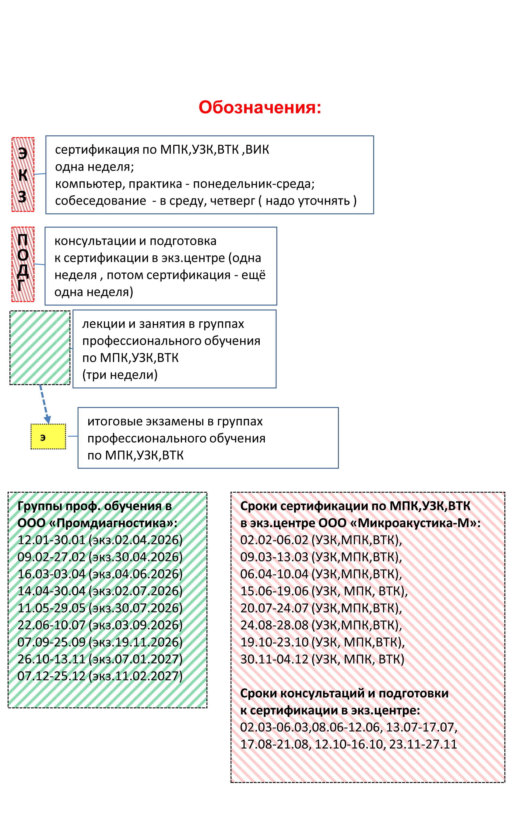 В этом расписании, кроме курсов профессиональной подготовки приведены также даты для подготовки и сдачи квалификационных экзаменов на I и II уровни сертификации/ресертификации по ГОСТ 9712-2023 в ООО "Магнитоакустические системы" (прежнее название - "Микроакустика-М").